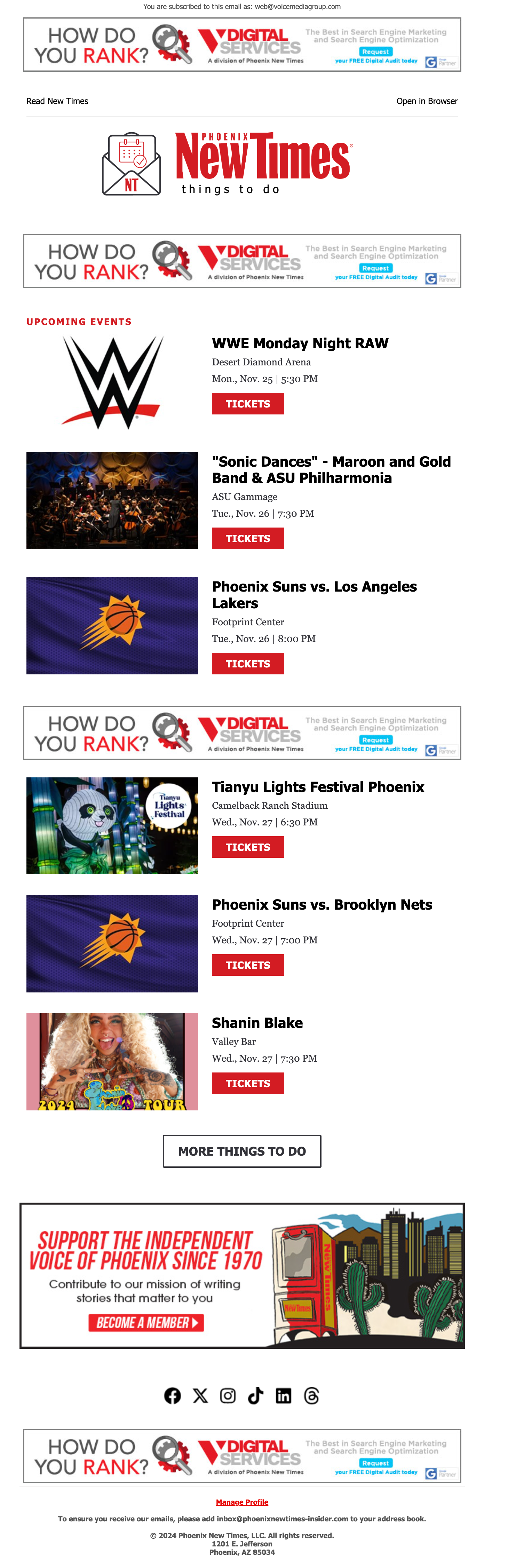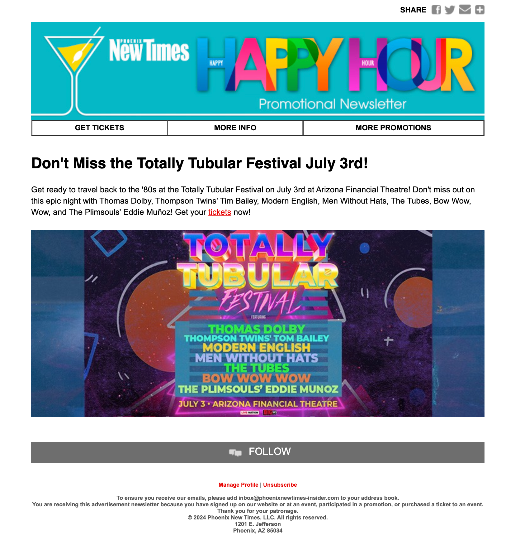 Get access to VIP events, free tickets, prize packages, and special offers available exclusively to our email subscribers. Delivered as needed Monday through Friday.